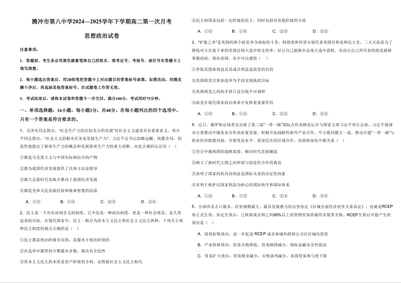 云南省保山市腾冲八中2024-2025学年下学期3月高二月考政治+答案