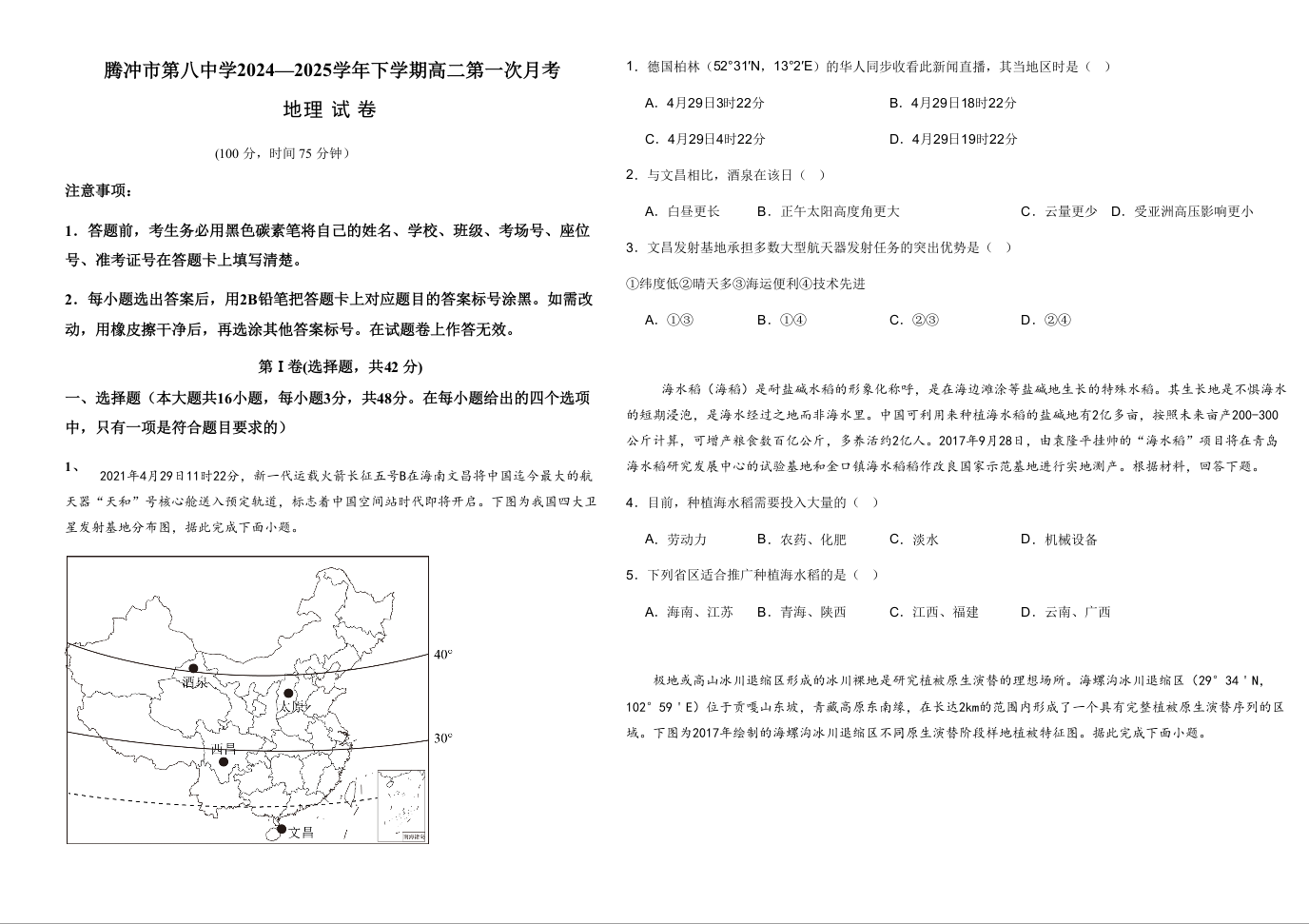 云南省保山市腾冲八中2024-2025学年下学期3月高二月考地理+答案