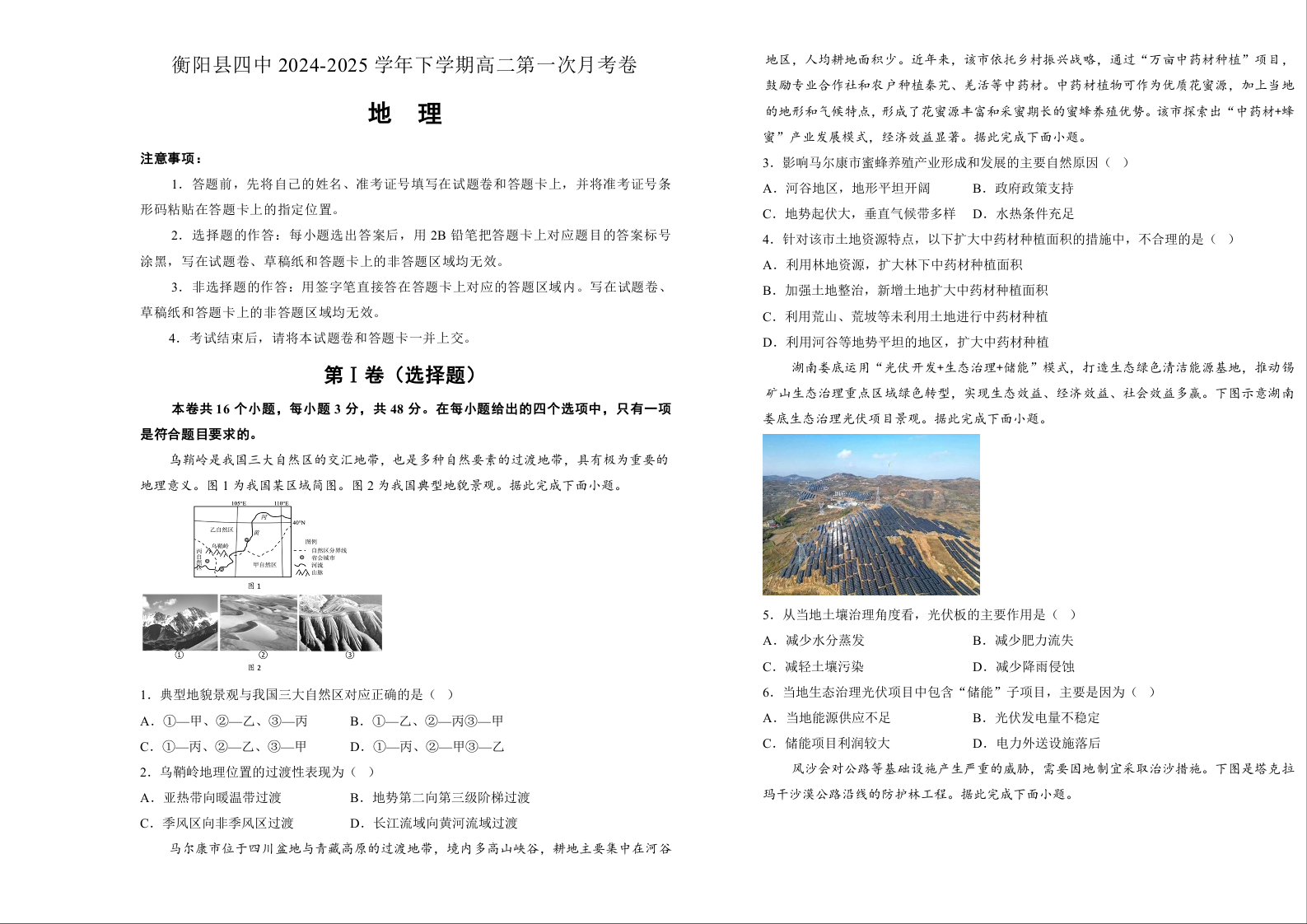 湖南省衡阳市衡阳四中2024-2025学年下学期3月高二第一次月考地理+答案