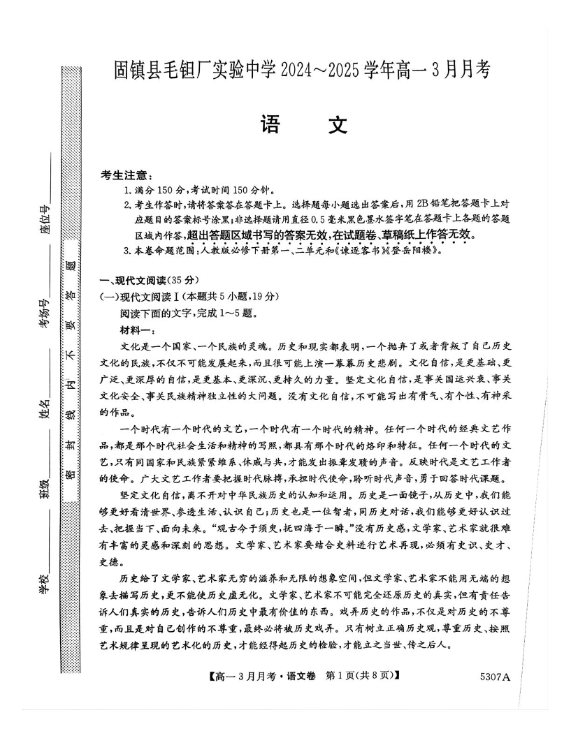 安徽省蚌埠市固镇县毛钽厂实验中学2024-2025学年下学期3月高一月考语文