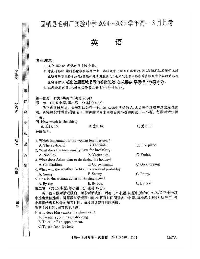 安徽省蚌埠市固镇县毛钽厂实验中学2024-2025学年下学期3月高一月考英语
