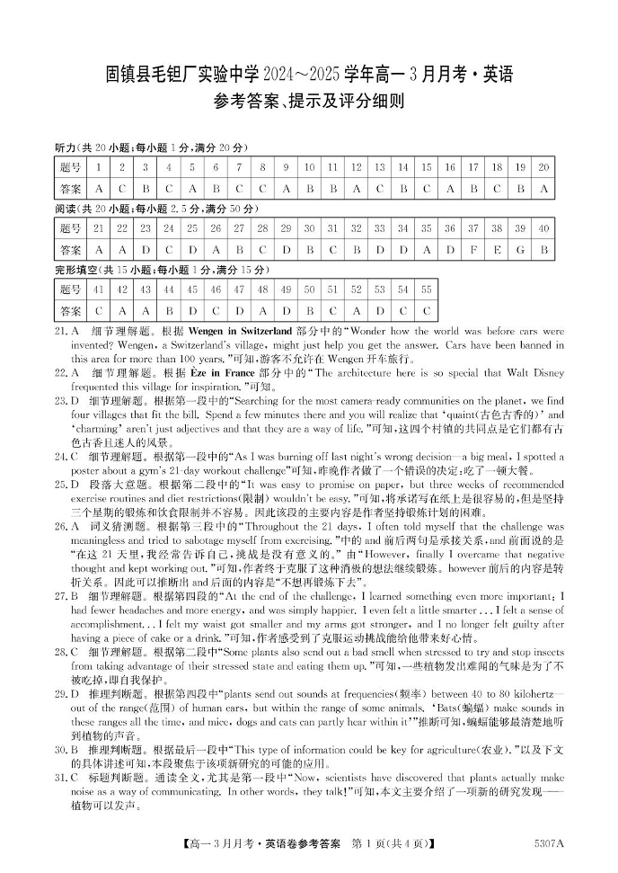安徽省蚌埠市固镇县毛钽厂实验中学2024-2025学年下学期3月高一月考英语答案