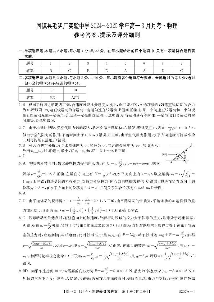 安徽省蚌埠市固镇县毛钽厂实验中学2024-2025学年下学期3月高一月考物理答案
