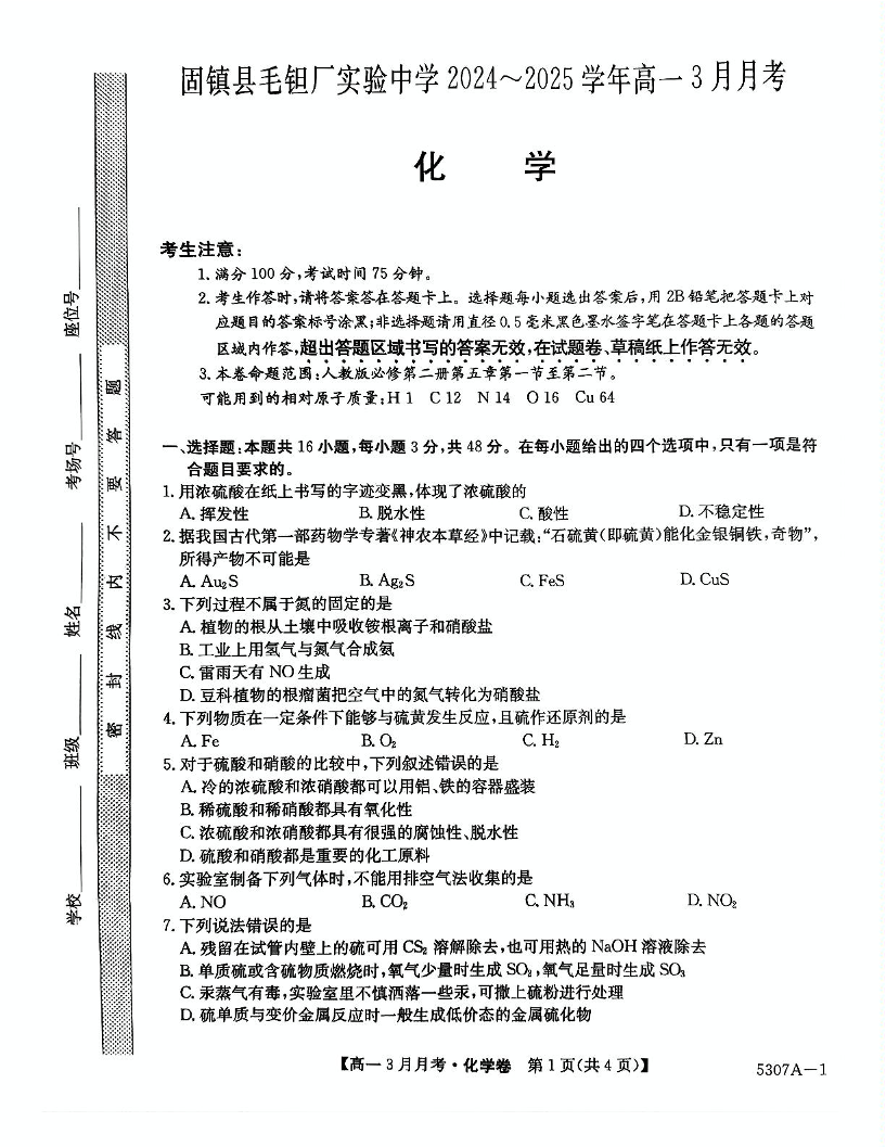 安徽省蚌埠市固镇县毛钽厂实验中学2024-2025学年下学期3月高一月考化学