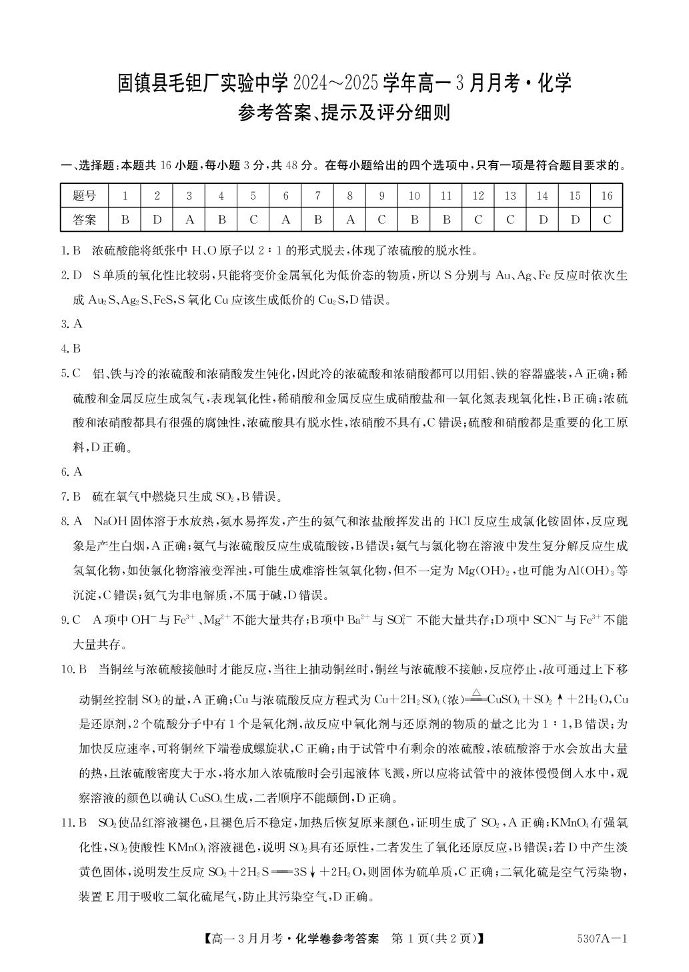 安徽省蚌埠市固镇县毛钽厂实验中学2024-2025学年下学期3月高一月考化学答案