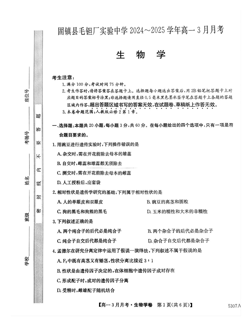 安徽省蚌埠市固镇县毛钽厂实验中学2024-2025学年下学期3月高一月考生物