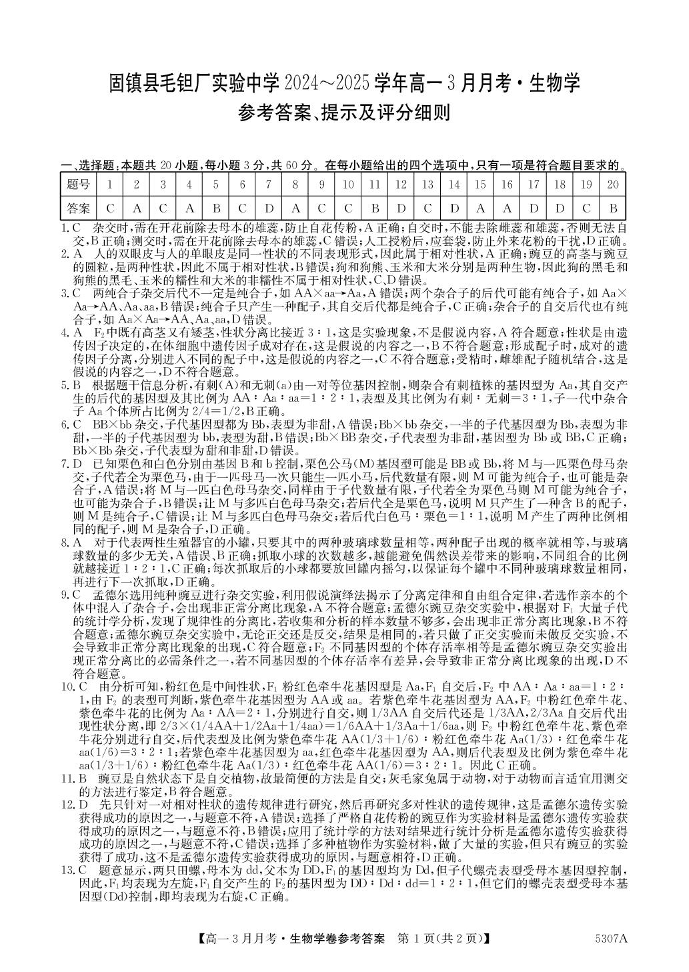 安徽省蚌埠市固镇县毛钽厂实验中学2024-2025学年下学期3月高一月考生物答案