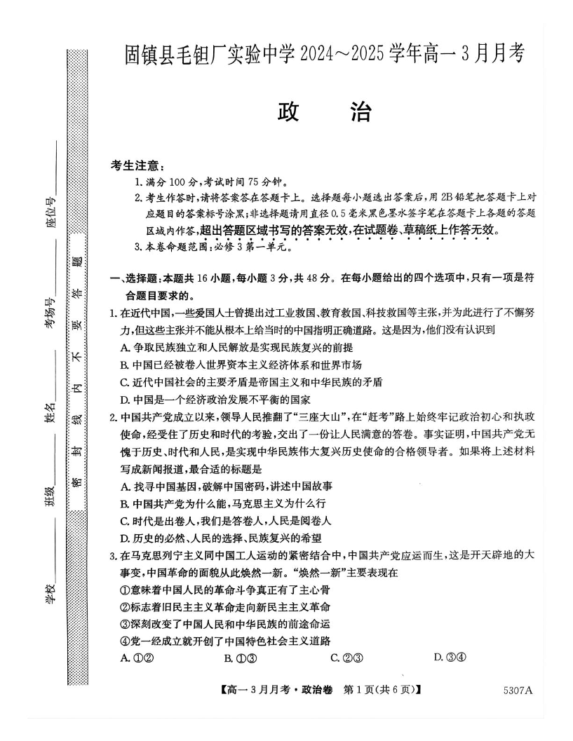 安徽省蚌埠市固镇县毛钽厂实验中学2024-2025学年下学期3月高一月考政治