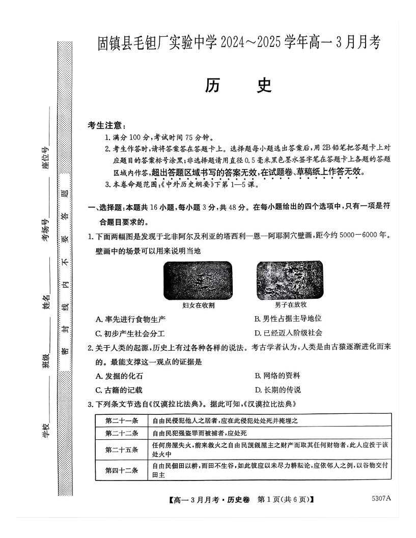 安徽省蚌埠市固镇县毛钽厂实验中学2024-2025学年下学期3月高一月考历史