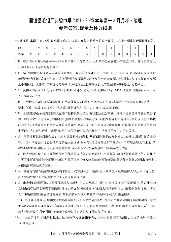 安徽省蚌埠市固镇县毛钽厂实验中学2024-2025学年下学期3月高一月考地理答案
