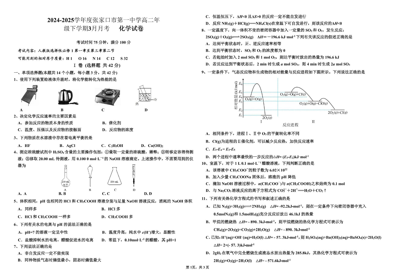 河北省张家口市第一中学2024-2025学年下学期3月高二月考化学+答案