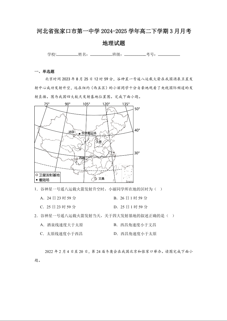 河北省张家口市第一中学2024-2025学年下学期3月高二月考地理+答案