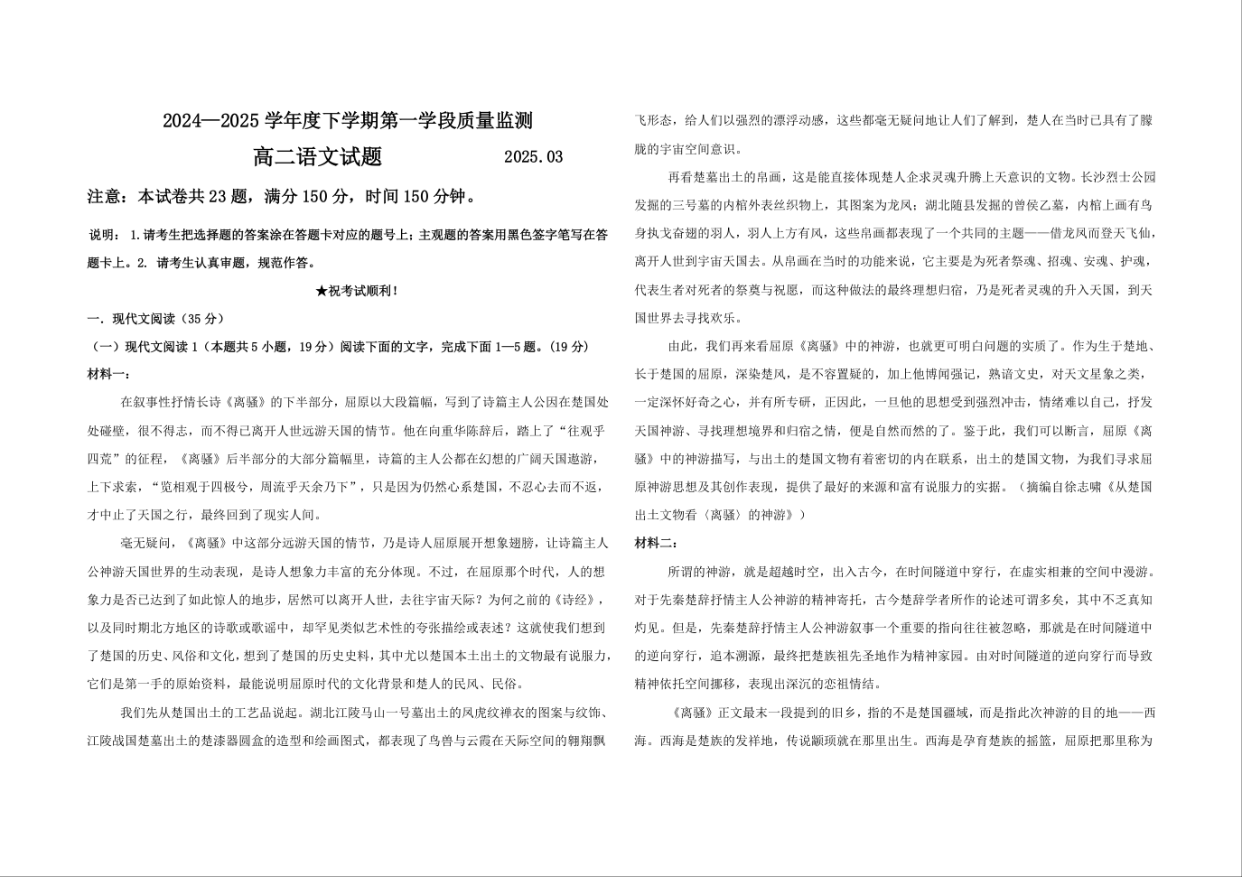 山东省济宁市微山县二中2024-2025学年下学期3月高二教学检测语文