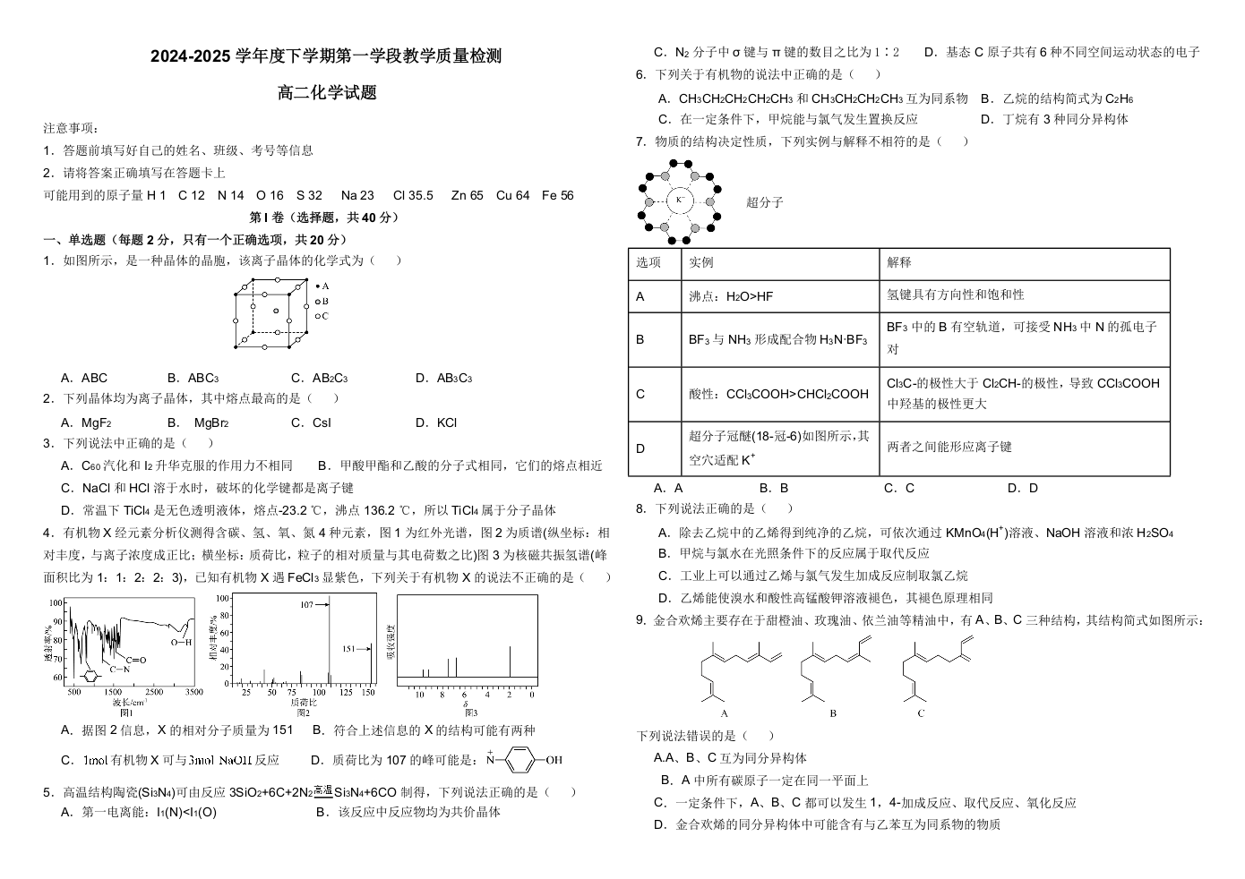 山东省济宁市微山县二中2024-2025学年下学期3月高二教学检测化学