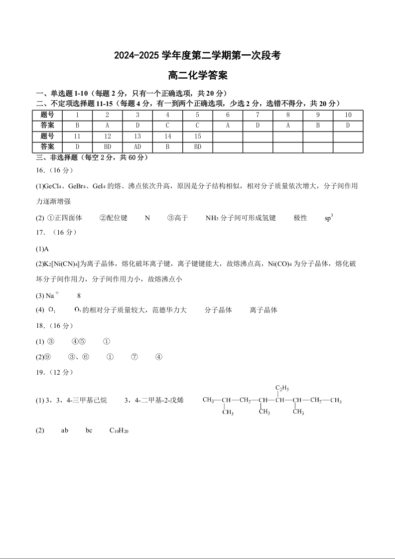 山东省济宁市微山县二中2024-2025学年下学期3月高二教学检测化学答案