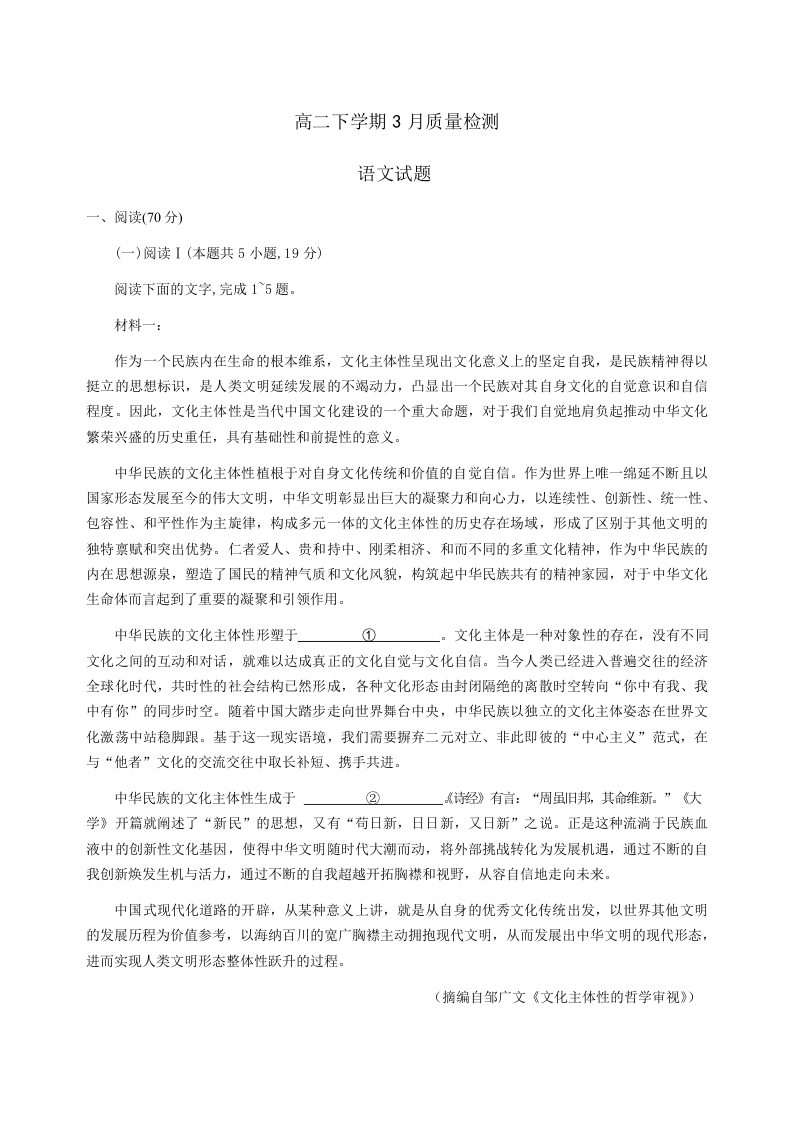 山东省济宁市邹城市二中2024-2025学年下学期3月高二质量检测语文+答案