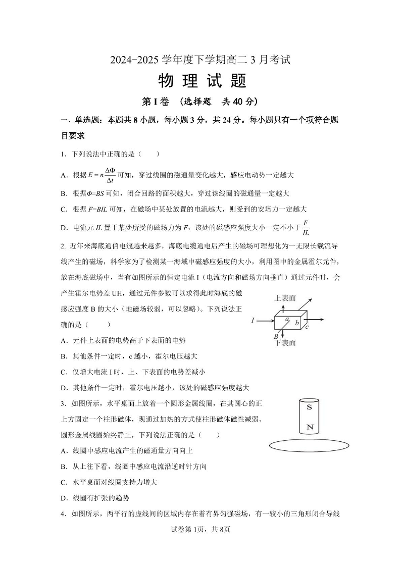 山东省济宁市邹城市二中2024-2025学年下学期3月高二质量检测物理+答案