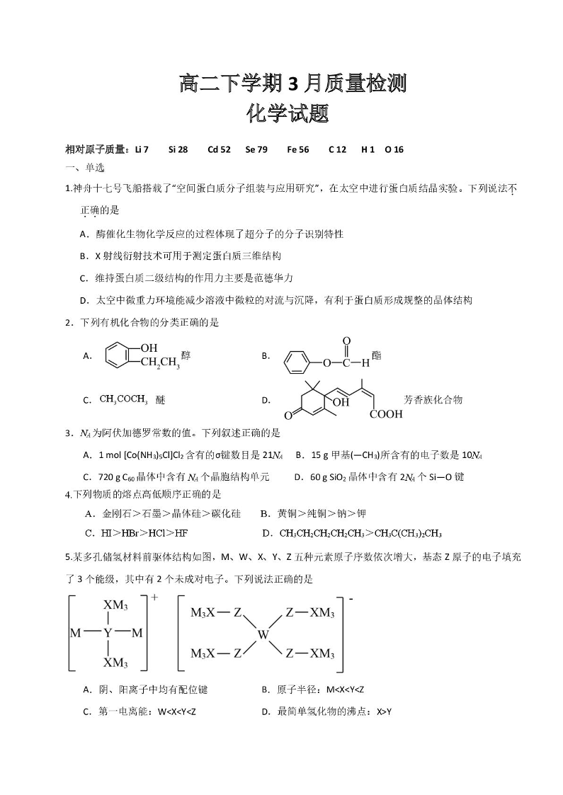山东省济宁市邹城市二中2024-2025学年下学期3月高二质量检测化学+答案
