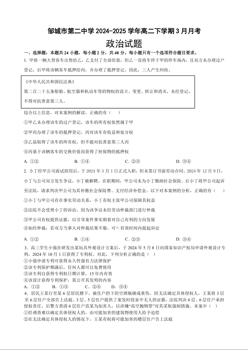 山东省济宁市邹城市二中2024-2025学年下学期3月高二质量检测政治+答案