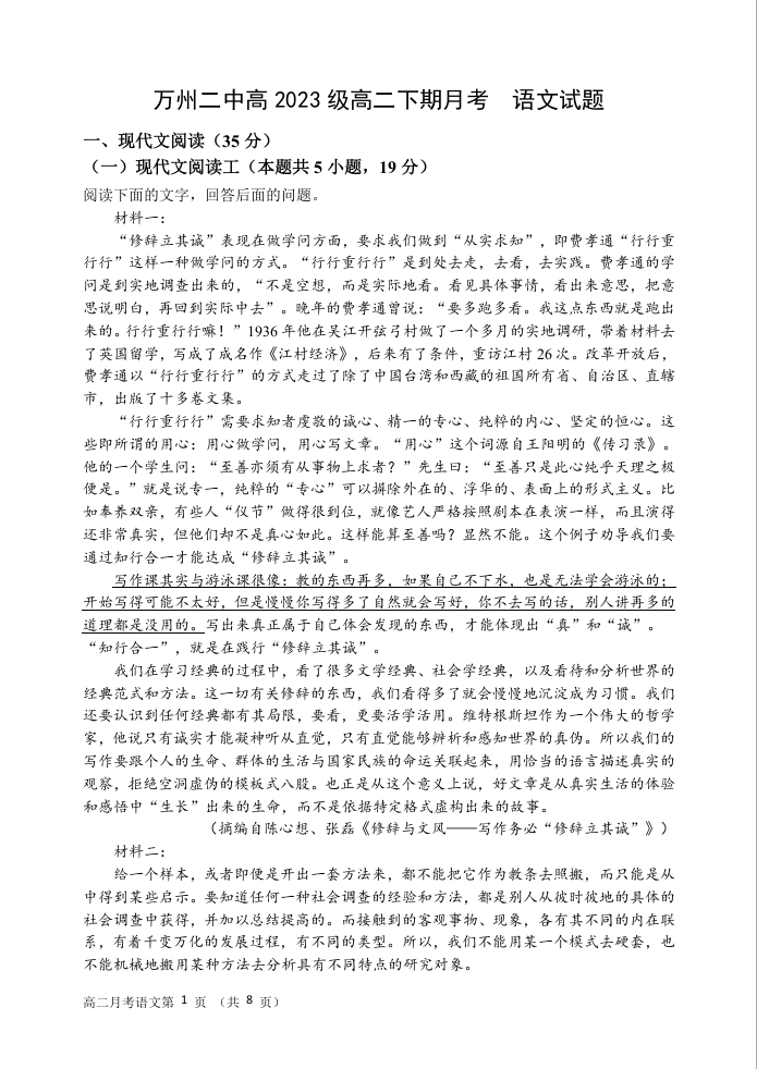 重庆市万州第二高级中学2024-2025学年下学期3月高二月考语文