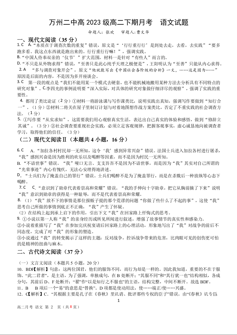 重庆市万州第二高级中学2024-2025学年下学期3月高二月考语文答案