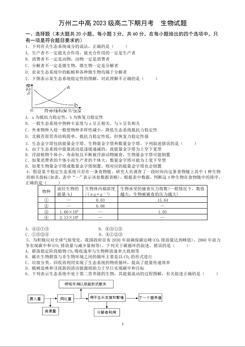 重庆市万州第二高级中学2024-2025学年下学期3月高二月考生物