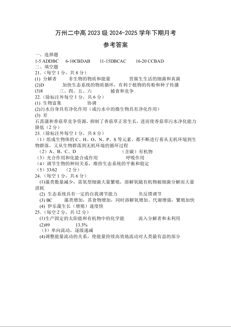 重庆市万州第二高级中学2024-2025学年下学期3月高二月考生物答案