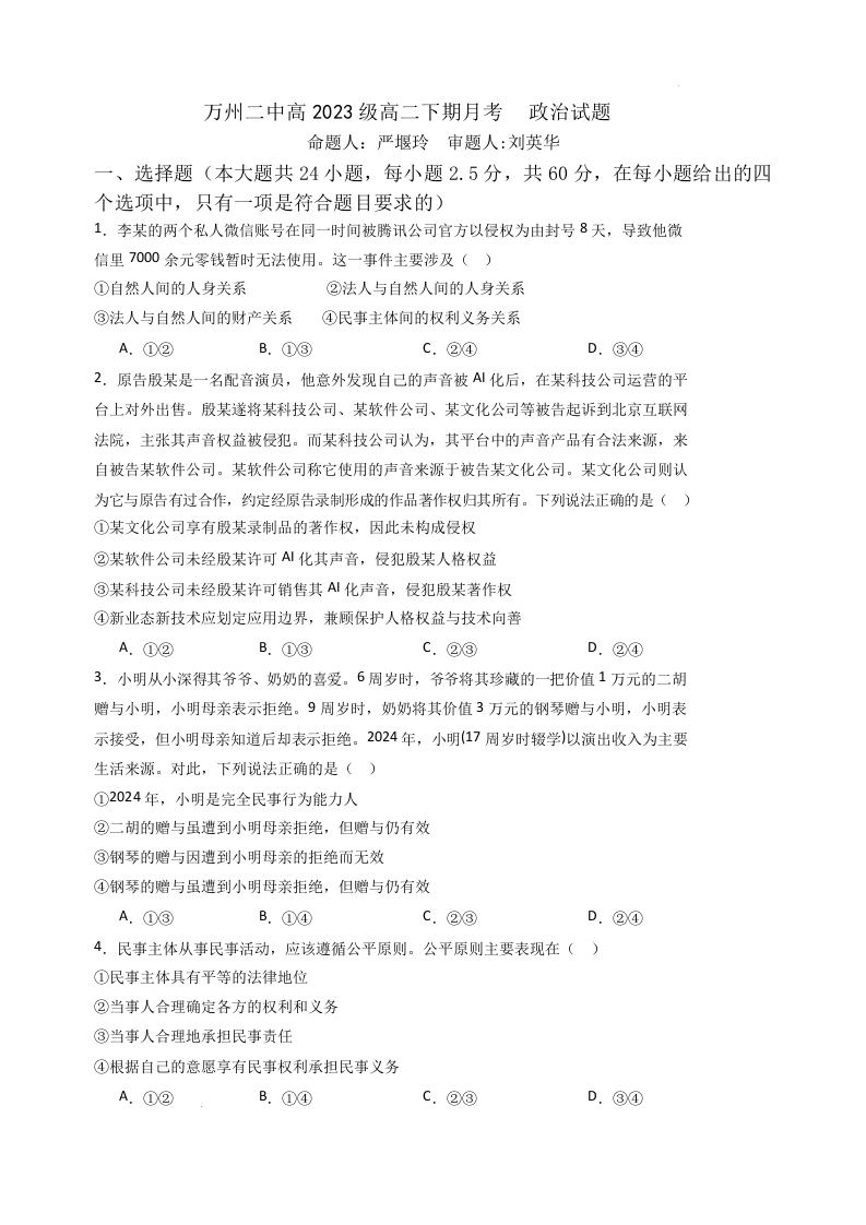 重庆市万州第二高级中学2024-2025学年下学期3月高二月考政治+答案