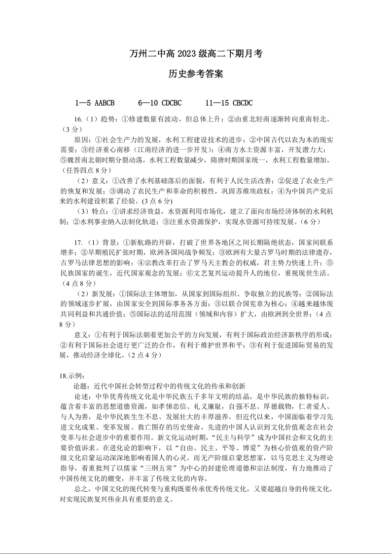 重庆市万州第二高级中学2024-2025学年下学期3月高二月考历史答案