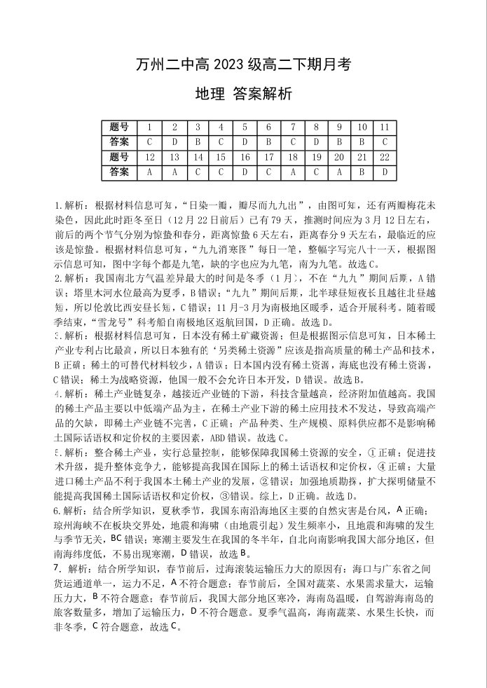 重庆市万州第二高级中学2024-2025学年下学期3月高二月考地理答案