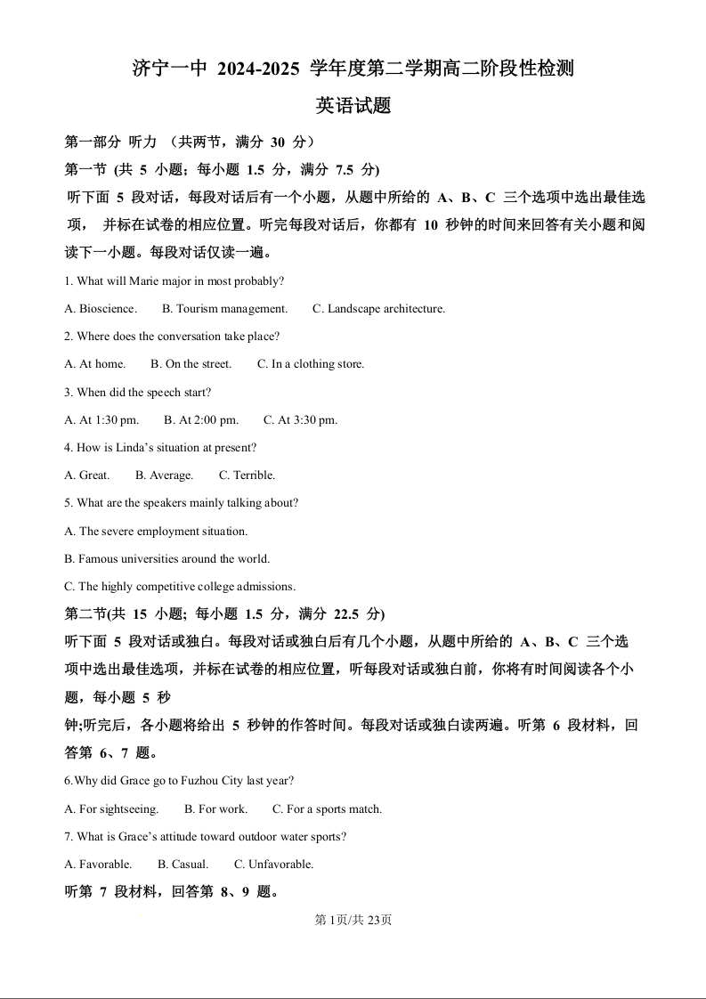 山东省济宁市第一中学2024-2025学年下学期3月高二月考英语(精品解析版)