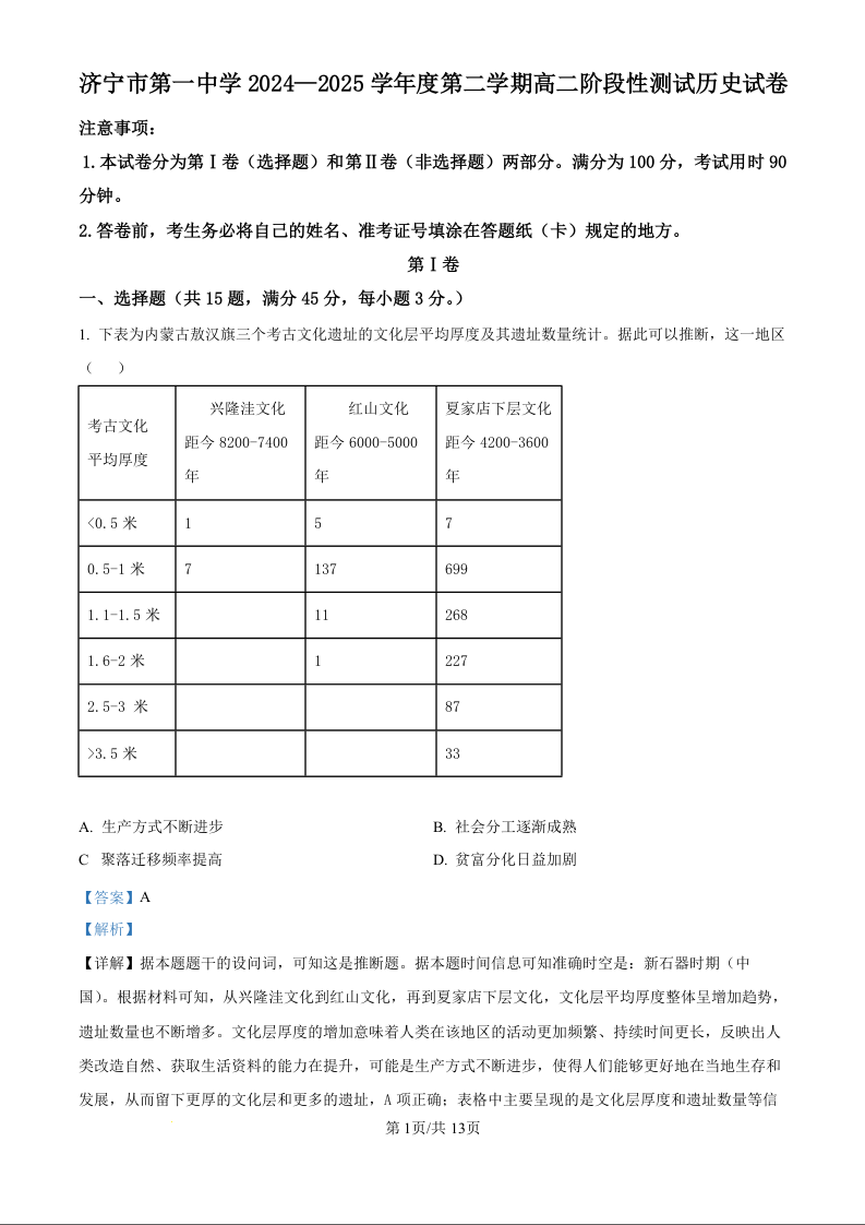 山东省济宁市第一中学2024-2025学年下学期3月高二月考历史(精品解析版)
