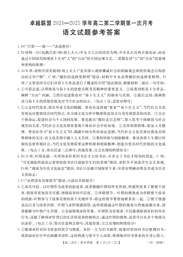 河北省邢台市卓越联盟2024-2025学年下学期3月高二第一次月考语文答案