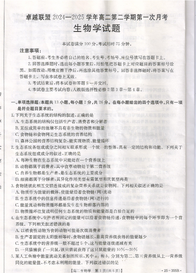 河北省邢台市卓越联盟2024-2025学年下学期3月高二第一次月考生物