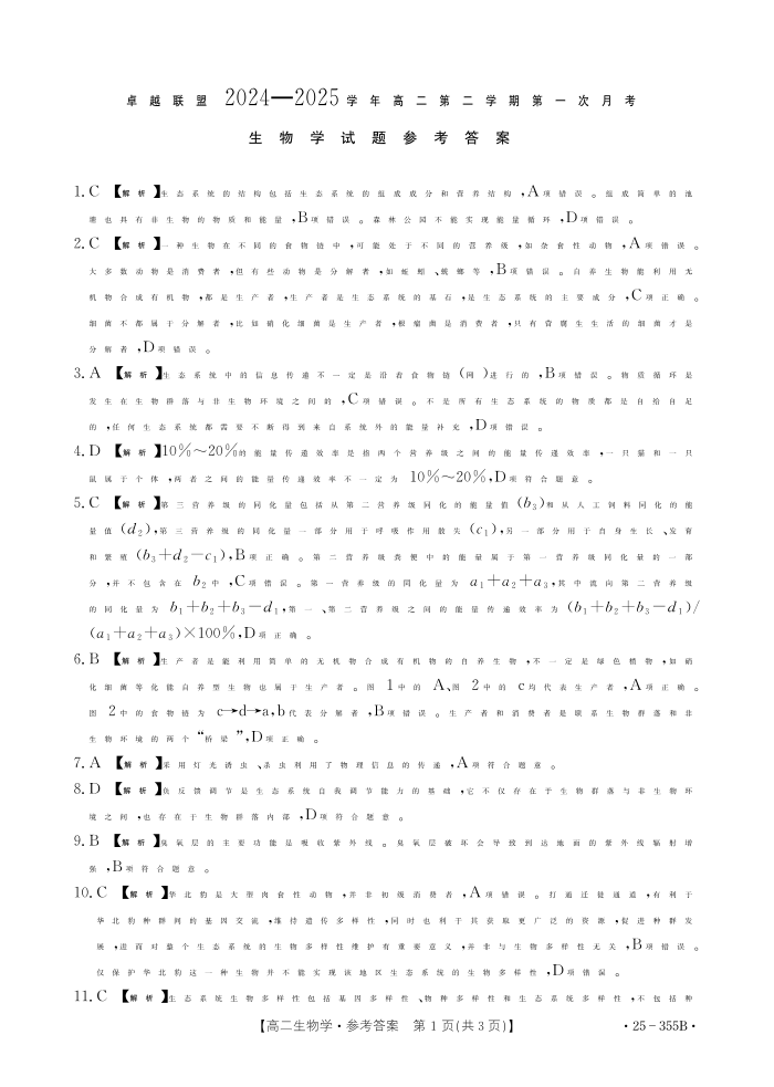 河北省邢台市卓越联盟2024-2025学年下学期3月高二第一次月考生物答案