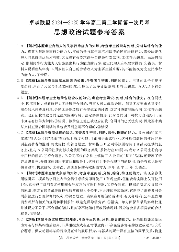 河北省邢台市卓越联盟2024-2025学年下学期3月高二第一次月考政治答案