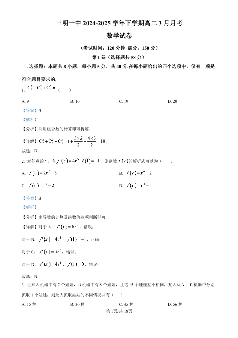 福建省三明第一中学2024-2025学年下学期3月高二月考数学(精品解析版)