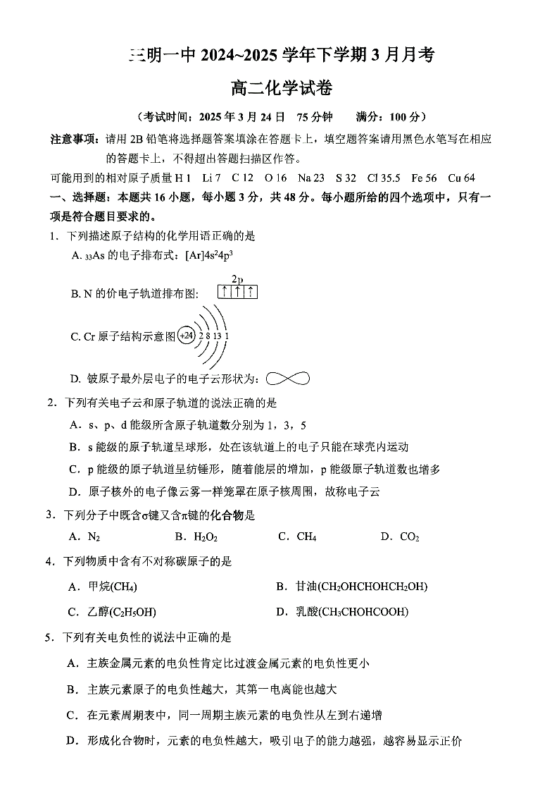 福建省三明第一中学2024-2025学年下学期3月高二月考化学+答案