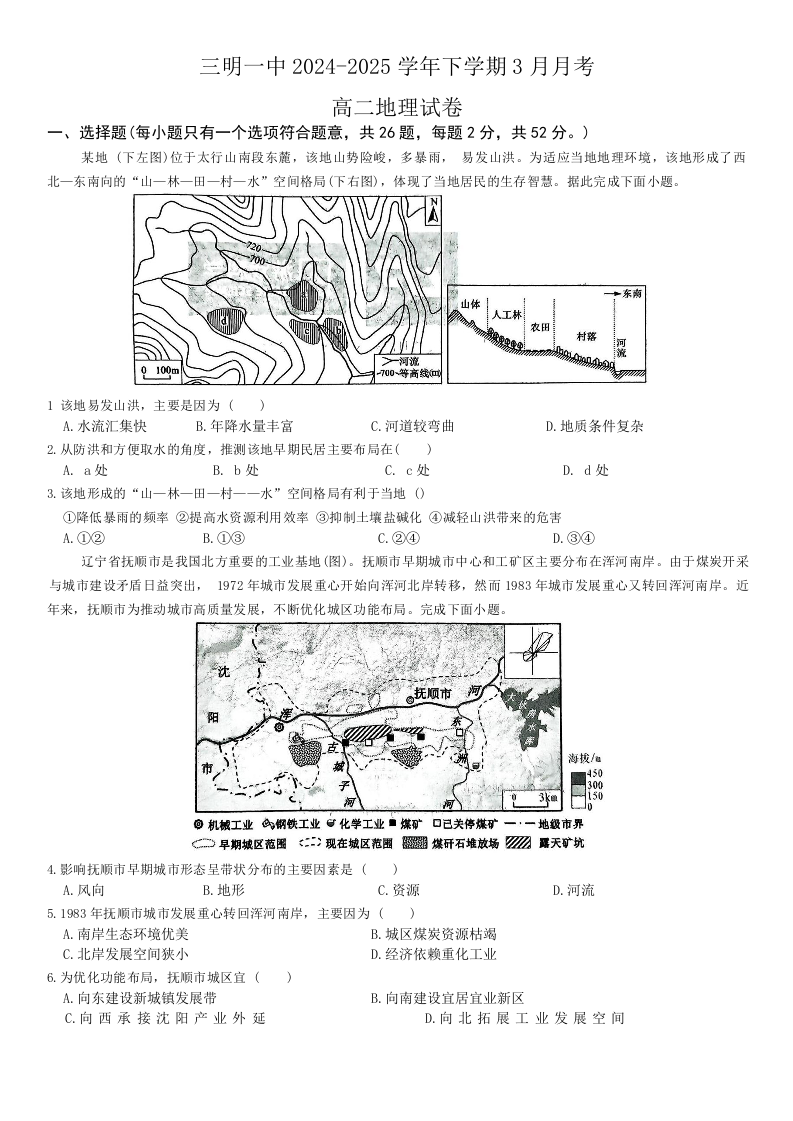 福建省三明第一中学2024-2025学年下学期3月高二月考地理+答案