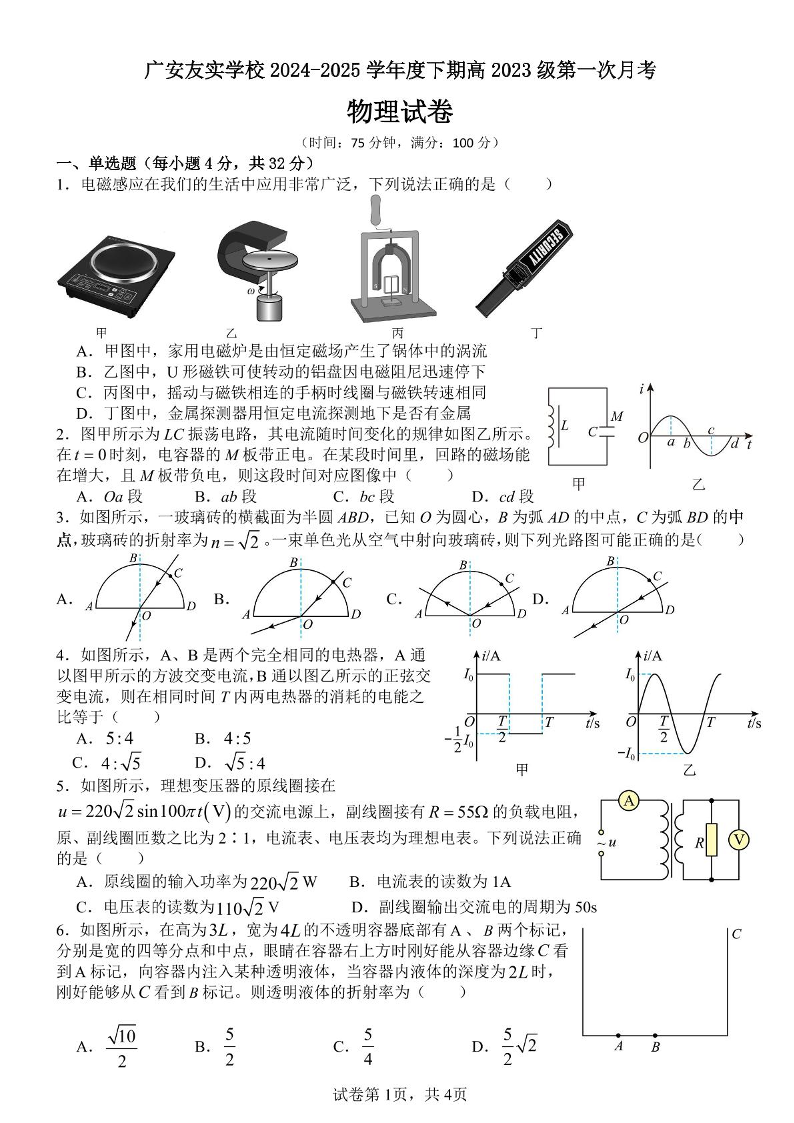 四川省广安市友实学校2024-2025学年下学期3月高二月考物理+答案