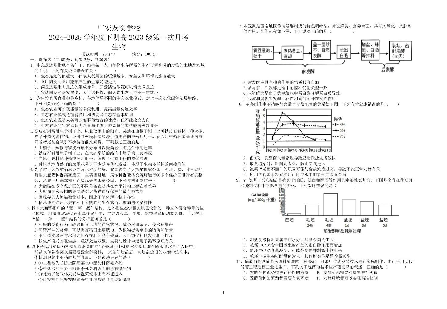 四川省广安市友实学校2024-2025学年下学期3月高二月考生物+答案