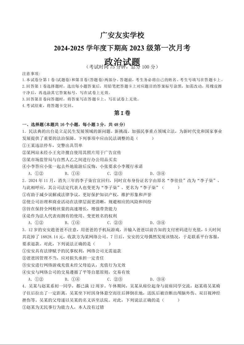 四川省广安市友实学校2024-2025学年下学期3月高二月考政治+答案