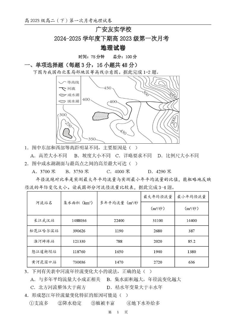 四川省广安市友实学校2024-2025学年下学期3月高二月考地理+答案