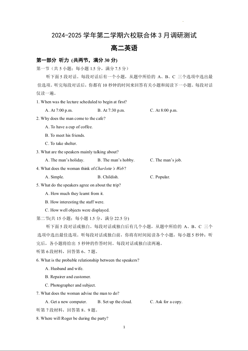 江苏省南京市六校2024-2025学年下学期3月高二联合调研英语
