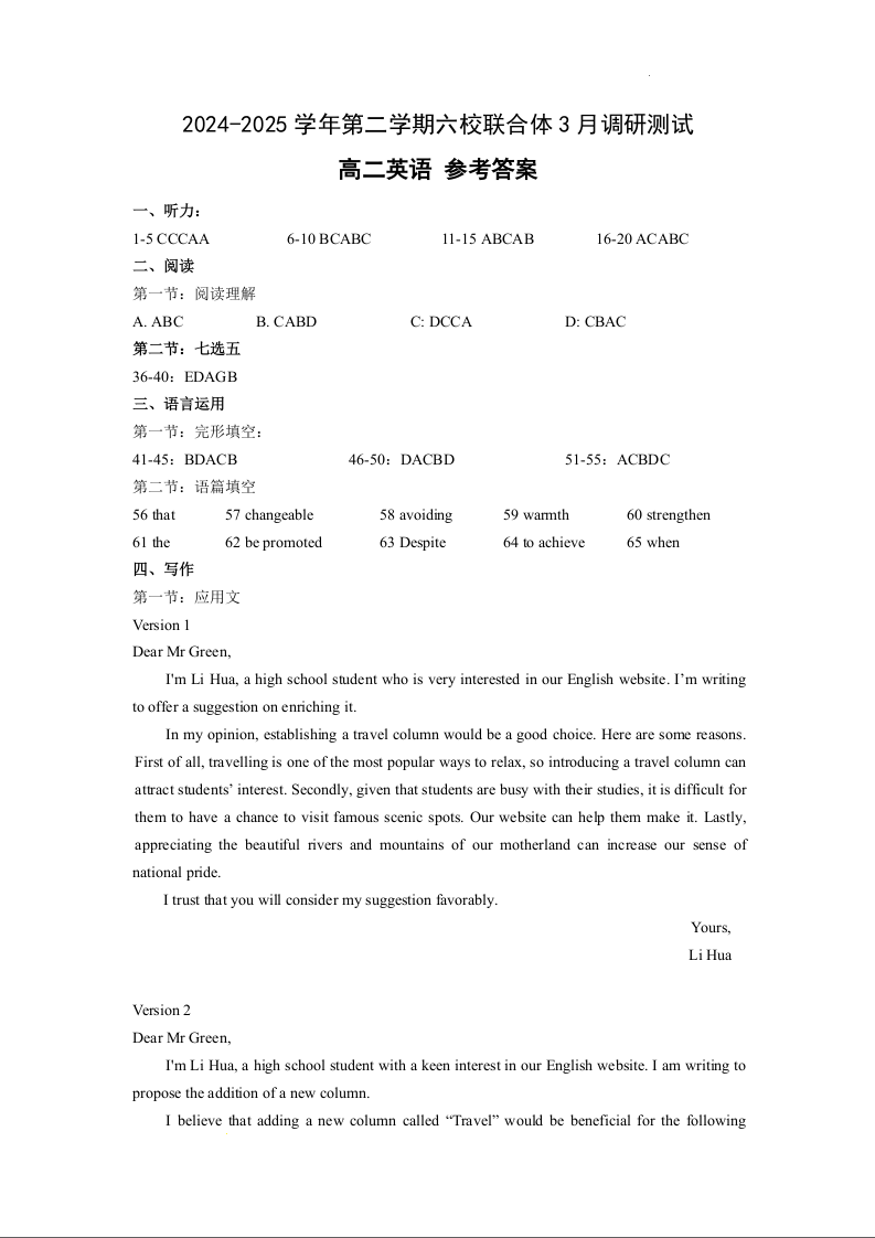 江苏省南京市六校2024-2025学年下学期3月高二联合调研英语答案