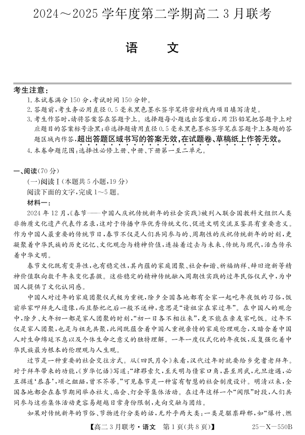 安徽省县中联盟2024-2025学年下学期3月高二联考语文+答案