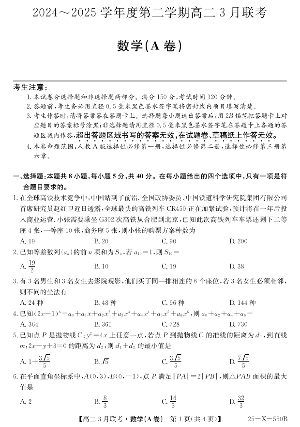 安徽省县中联盟2024-2025学年下学期3月高二联考数学A+答案