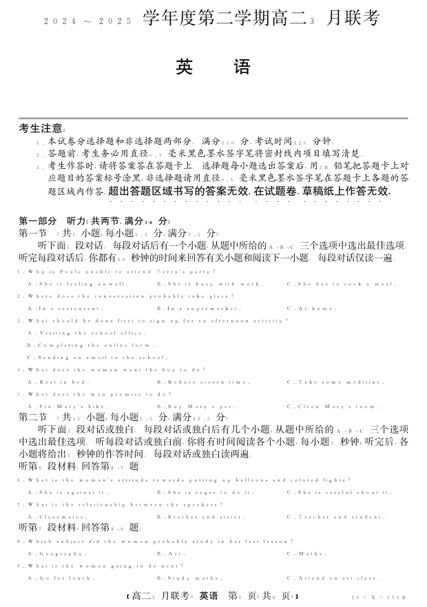 安徽省县中联盟2024-2025学年下学期3月高二联考英语+答案解析