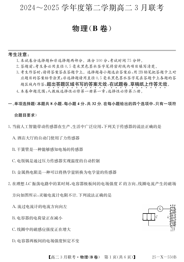 安徽省县中联盟2024-2025学年下学期3月高二联考物理B+答案