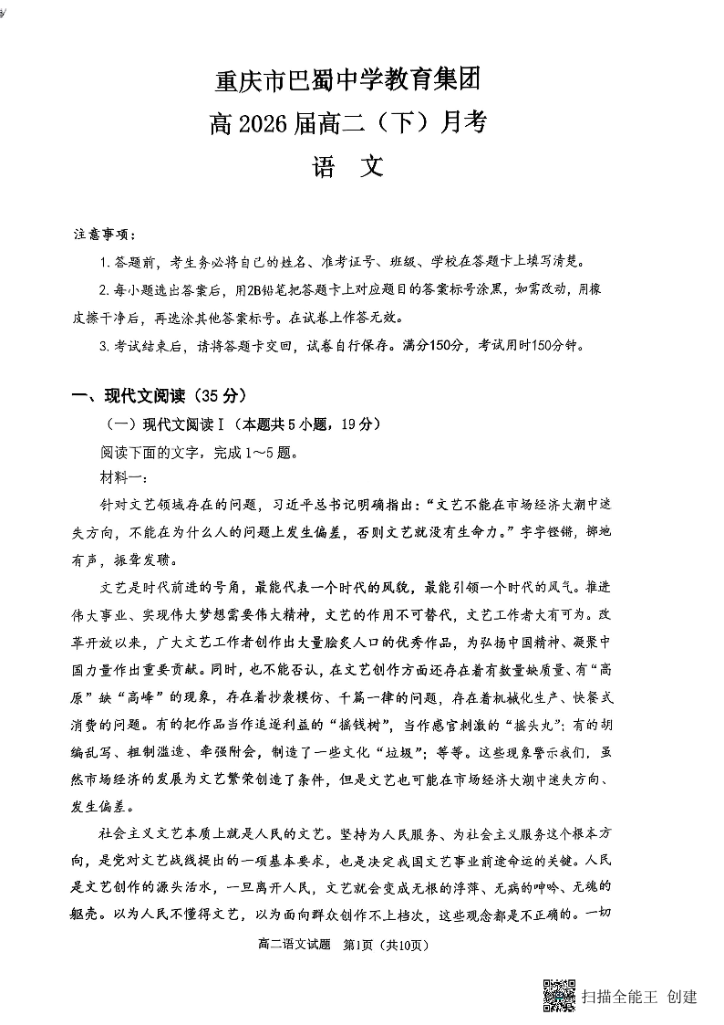 重庆市巴蜀中学2024-2025学年下学期3月高二月考语文